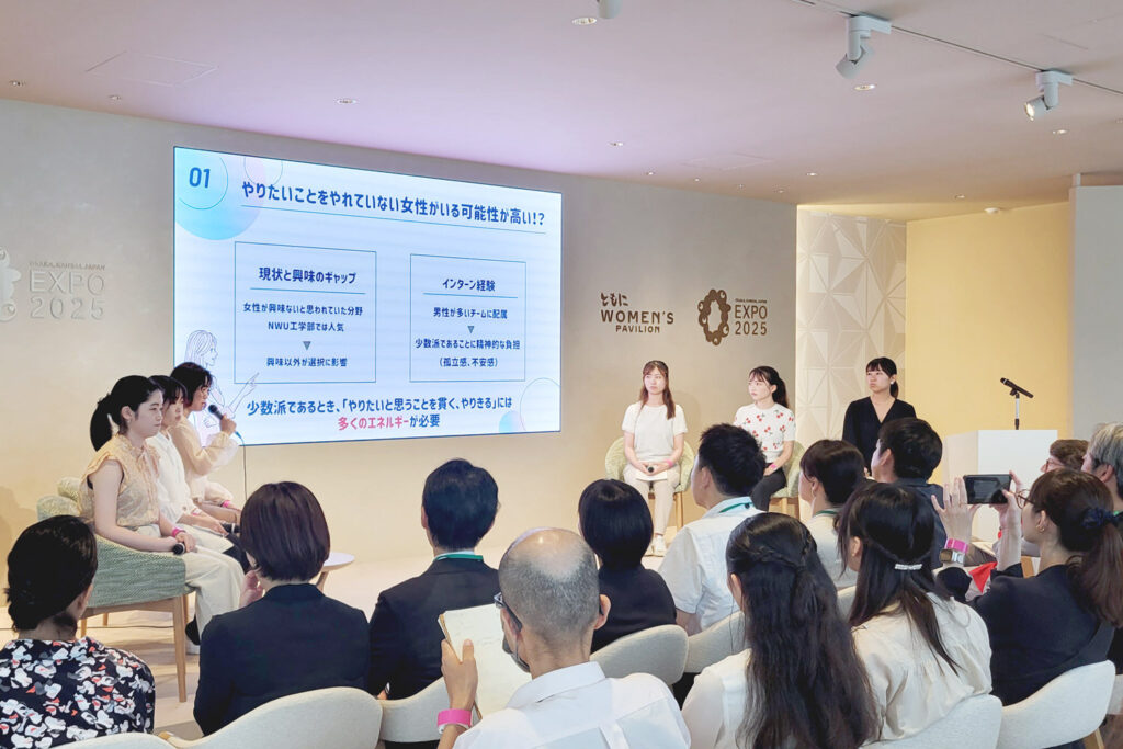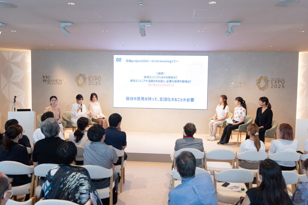 その成果をもとに〈大阪万博での発表〉を参加者が主体となり企画し、7月17日にはWomen’s Pavilionにて「未来の女性技術者」としての抱負と産業界への展望についてプレゼンテーションを行いました。