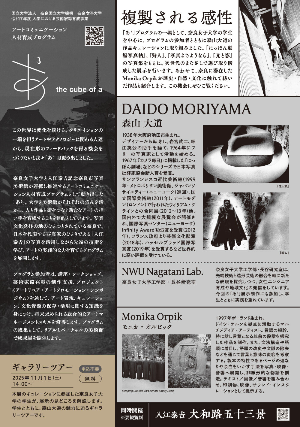 奈良女子大学と入江泰吉記念奈良市写真美術館が連携し推進するアートコミュニケーション人材育成プログラムとして動き出した「あ3」プロジェクト。その成果展「複製される感性」が11月1日(土) より開催されます。