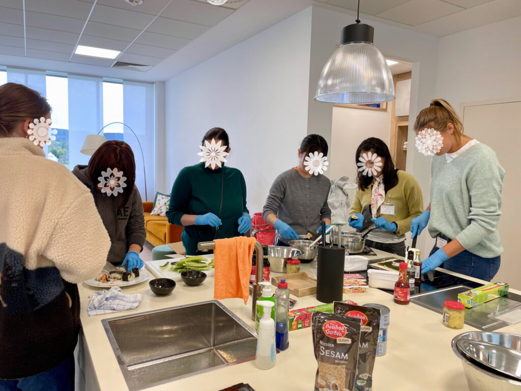 スパイス工場を見学し、こんなにも間近で生産の様子を見られることは日本ではあまりないだろうと感じました。髪の毛が入らないように保護したり、入場の際に風で塵を落としたりといった対策はありましたが、工場内でマスクを着けていなくてもよい雰囲気であったことに、文化の違いを感じました。まさかドイツで醤油が作られている様子を見学できるとは思っていなかったため、とても驚きました。工場全体がスパイスの香りに包まれており、見学が終わるころには鼻が少し麻痺したような感覚になっていて、面白い体験でした。また、お昼ご飯はドイツの学生たちと一緒におにぎりや海苔巻きを作りました。試行錯誤しながら作るのは大変でしたが、とても楽しかったです。おにぎりを作ったことがないと言っていた子が喜んでいる姿を見て、私も嬉しい気持ちになりました。
