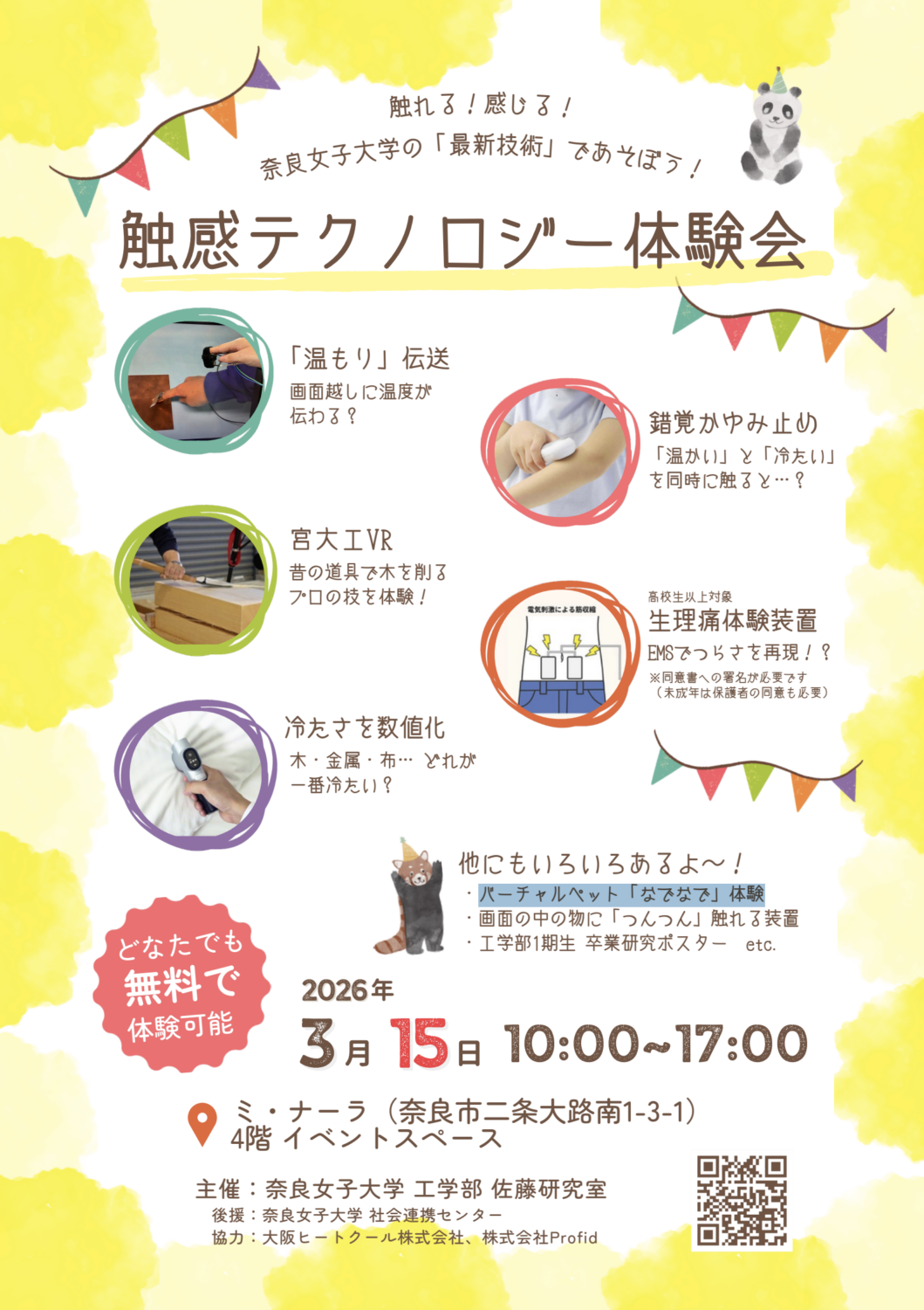 奈良女子大学の最新技術を使用した、 ⭐️宮大工VR体験 ⭐️素材の冷たさを数値化してみよう ⭐️生理痛体験システム ⭐️バーチャルペット「なでなで」体験 ほか多数の体験ワークショップを開催しています。そのほか、工学部一期生(2025年度卒業生)の卒業研究ポスターも展示される予定です。
