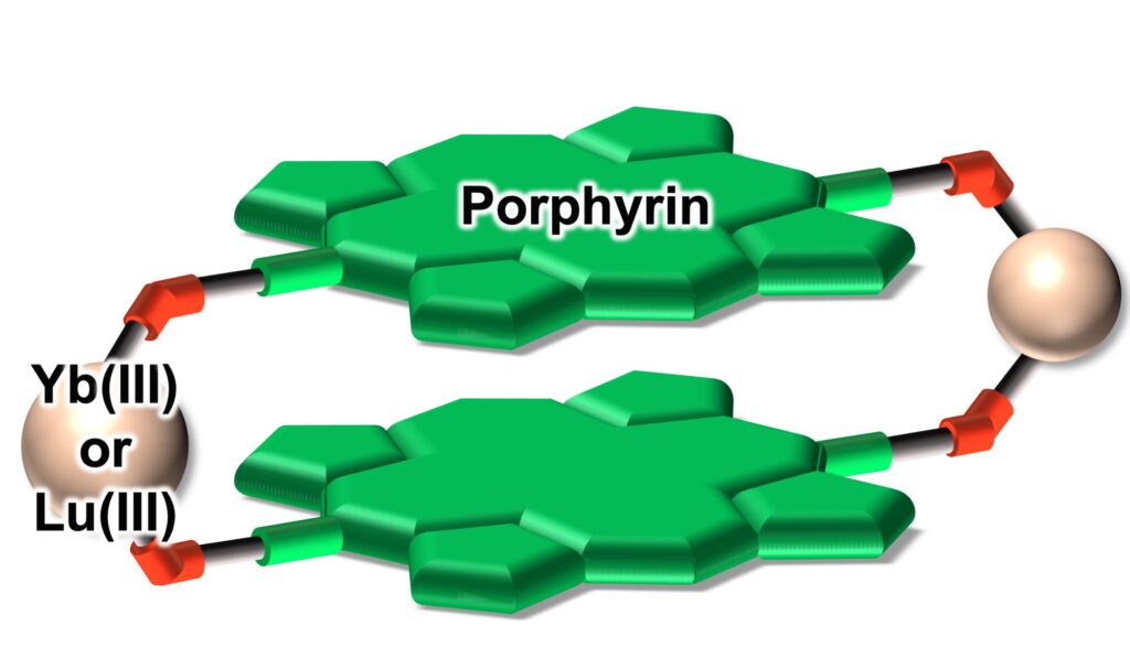 ポルフィリン色素が希土類錯体で架橋されてスタックした二量体の合成に成功しています。ポルフィリンが光増感剤として機能することで、希土類錯体の近赤外発光も観測されています。また、この二量体構造は単量体のポルフィリンよりも光安定性が高いこともわかりました。